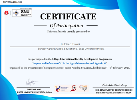 Mr. Kuldeep Tiwari successfully participated in a 5 Days International Faculty Development Program on “Impact and Influence of AI in the Age of Generative and Agentic AI.” The program was organized by the Department of Computer Science, Sister Nivedita University, India, and was conducted from 2 February 2026 to 6 February 2026. It focused on the transformative role of generative and agentic artificial intelligence in academia, research, and industry, significantly enhancing academic insight and practical understanding of emerging AI technologies.