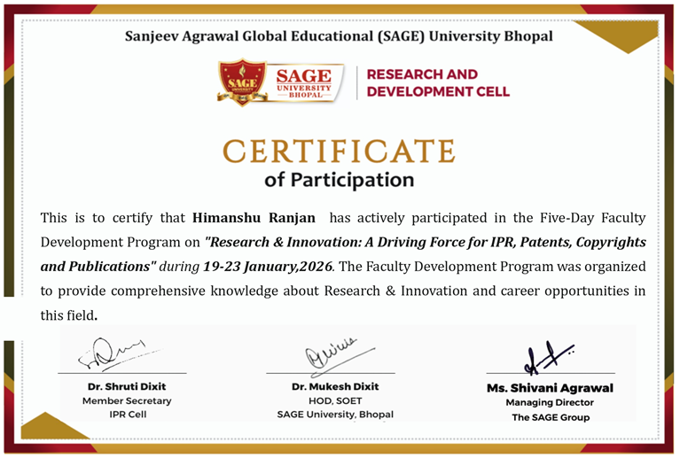 Himanshu Ranjan participated in the Five-Day Faculty Development Program on “Research & Innovation: A Driving Force for IPR, Patents, Copyrights and Publications” held from 19–23 January, 2026. from sage university.