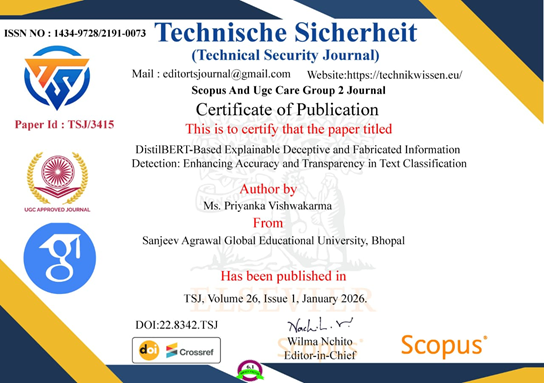 Ms. Priyanka Vishwakarma from Sanjeev Agrawal Global Educational University, Bhopal, published a paper titled “DistillBERT-Based Explainable Deceptive and Fabricated Information Detection: Enhancing Accuracy and Transparency in Text Classification” in Technische Sicherheit (Technical Security Journal), Volume 26, Issue 1, January 2026 (Paper ID: TSJ/3415, DOI: 22.8342.TSJ)