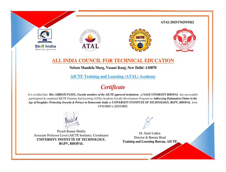 Ms. Shristi Patel, Assistant Professor, SAGE University, Bhopal, has successfully completed an AICTE–ATAL Faculty Development Program (FDP) on “Addressing Defamation Crimes in the Age of Deepfake”, organized by University Institute of Technology (UIT), RGPV, Bhopal, from 17th to 22nd January 2025.