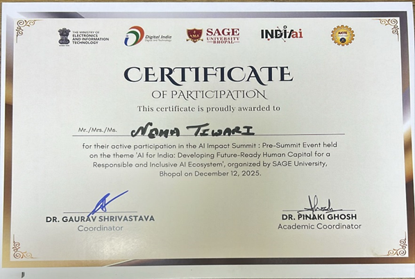 Ms. NEHA TIWARI, Assistant Professor at SAGE University, Bhopal, actively participated in the AI Impact Summit – Pre-Summit Event on the theme “AI for India: Developing Future-Ready Human Capital for a Responsible and Inclusive AI Ecosystem”, held on 12 December 2025 in Bhopal. This participation highlights her dedication to continuous learning and engagement with emerging AI technologies .