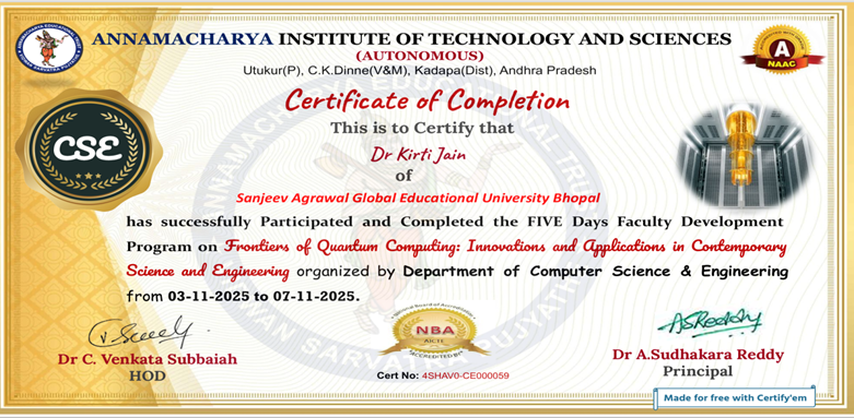 Dr. Kirti Jain from Sanjeev Agrawal Global Educational University, Bhopal successfully completed a Five-Day Faculty Development Program on “Frontiers of Quantum Computing: Innovations and Applications in Contemporary Science and Engineering,” organized by the Department of Computer Science & Engineering at Annamacharya Institute of Technology and Sciences, Andhra Pradesh, held from 03–11–2025 to 07–11–2025.